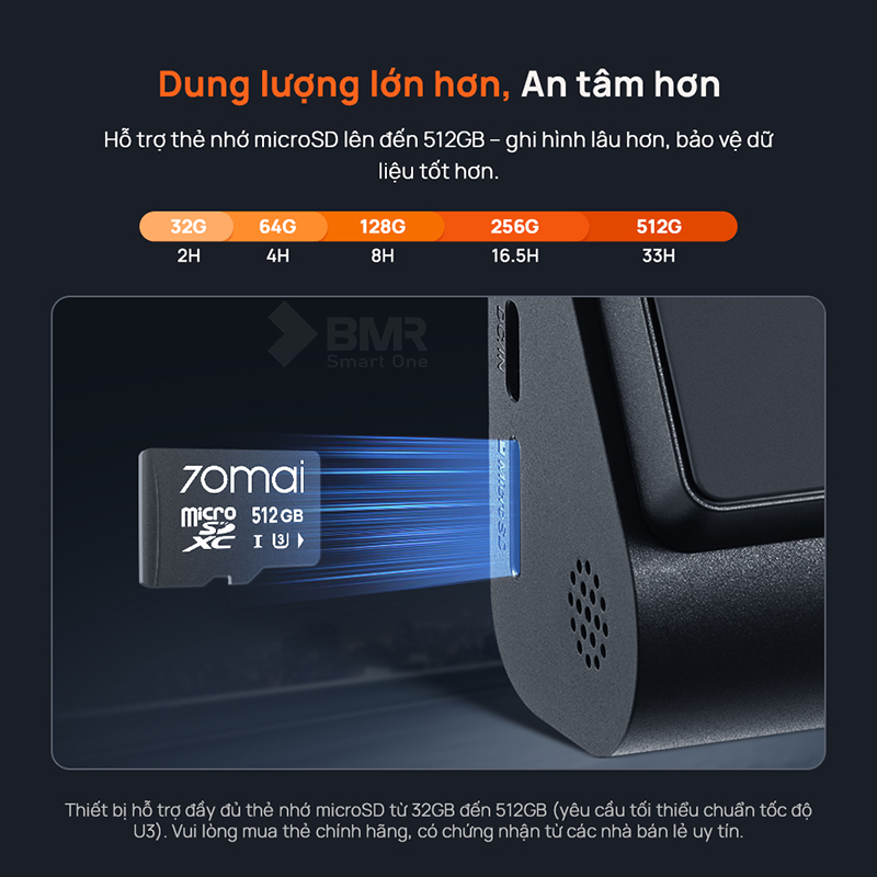 Với dung lượng lưu trữ tối đa lên đến 512GB, camera hành trình 70mai A800SE hỗ trợ lưu trữ video dài ngày hơn, giảm nguy cơ ghi đè video quan trọng, quay 4K sắc nét thoải mái.